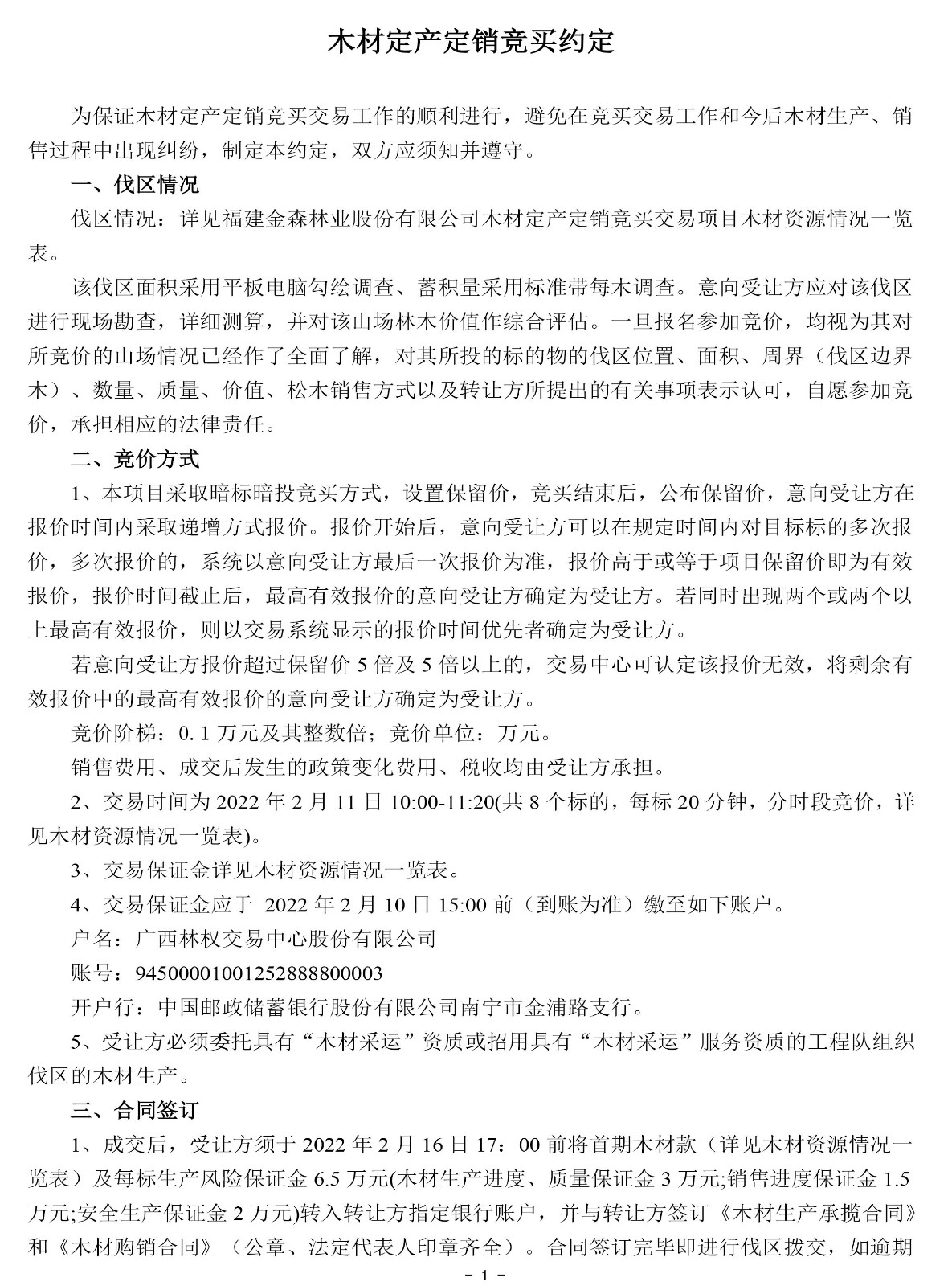 保證金及 處理方式 | 1.須交納的交易保證金詳見木材資源情況一覽表。 2.交易保證金應(yīng)于2022年2月10日15:00前(到賬為準(zhǔn))繳至如下賬戶: 戶名:廣西林權(quán)交易中心股份有限公司 賬號:94500001001252888800003 開戶行:中國郵政儲蓄銀行股份有限公司南寧市金浦路支行 注: ①交易保證金只接受銀行柜臺、網(wǎng)銀、電匯轉(zhuǎn)賬,不接受ATM轉(zhuǎn)賬、現(xiàn)金繳款; ②交易保證金轉(zhuǎn)賬單上須注明參與競拍哪一標(biāo)的保證金 (如:0211金森1標(biāo)保證金)。 3. 交易成交,在收到交易雙方出具的《款項(xiàng)收訖及正式書面合同簽訂確認(rèn)函》后的5個工作日內(nèi),受讓方已交納的交易保證金由交易中心直接轉(zhuǎn)到福建金森林業(yè)股份有限公司指定銀行賬戶充抵履約保證金。 4.交易成交,受讓方如未按本公告約定與轉(zhuǎn)讓方簽訂成交文件的,或違反交易中心交易規(guī)則的,其已交納的交易保證金將不予返還; 5.未成交者的交易保證金交易中心將在交易結(jié)束后次日起3個工作日內(nèi)全額無息返還。 | ||