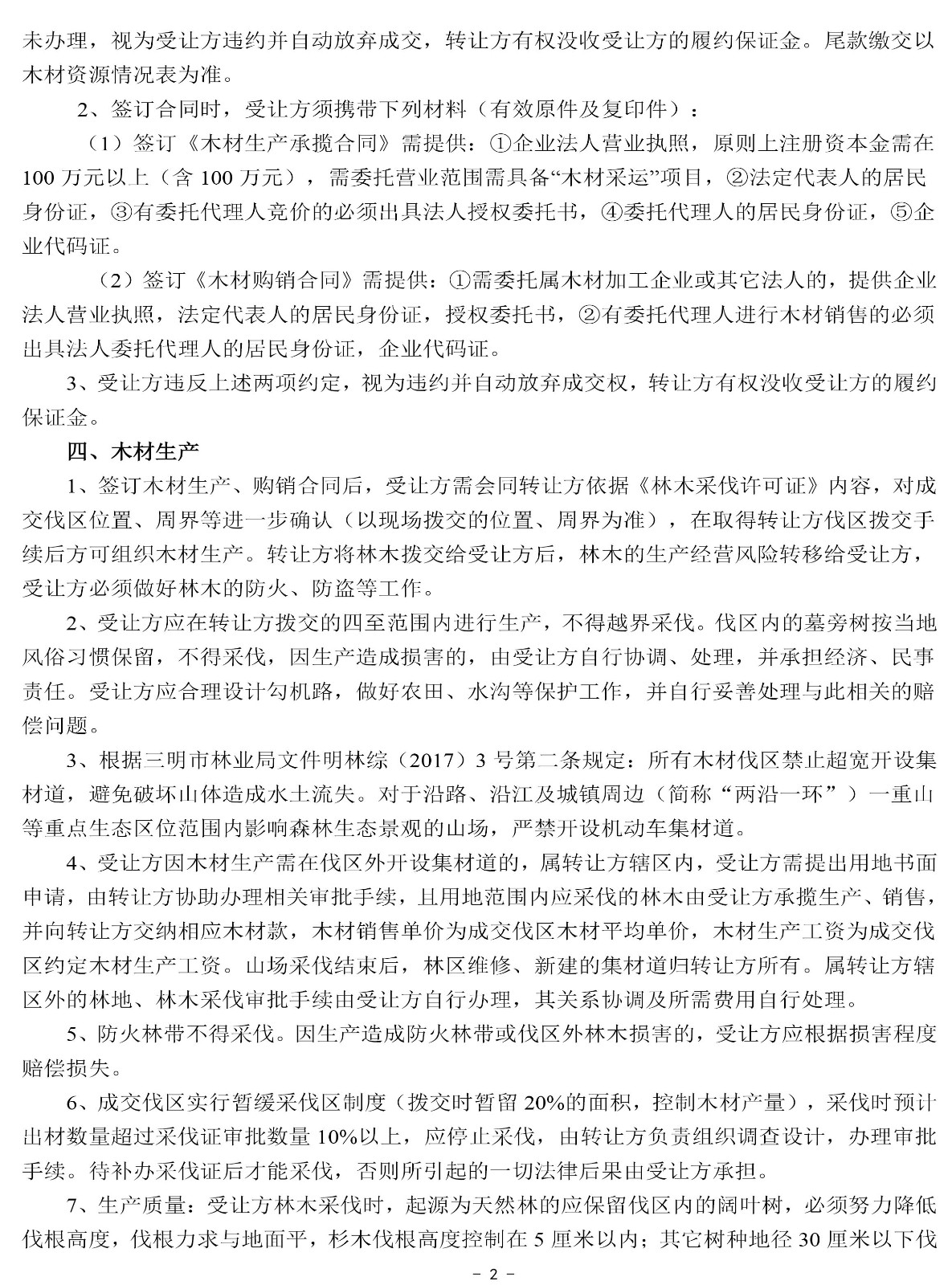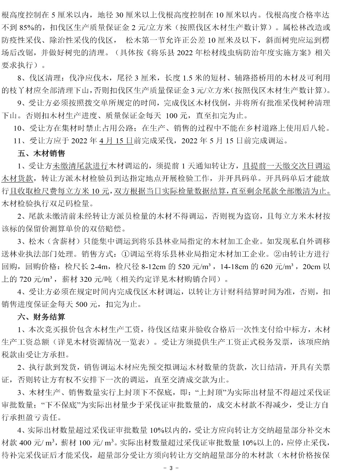 重要信息披露 | 1、標(biāo)的簡介所列的出材量等數(shù)據(jù)僅供參考,標(biāo)的以現(xiàn)狀交付,轉(zhuǎn)讓方及交易中心不承擔(dān)標(biāo)的面積與實(shí)測面積、標(biāo)的出材量與實(shí)際出材量差異等責(zé)任,不調(diào)整相應(yīng)的成交價格。 2、本次競買報價包含木材生產(chǎn)工資,木材生產(chǎn)工資總額詳見木材資源情況一覽表,待伐區(qū)結(jié)束并驗(yàn)收后一次性支付給受讓方。 3、銷售費(fèi)用、成交后發(fā)生的政策變化費(fèi)用、稅收均由受讓方承擔(dān)。 4、松木(含薪材)只能集中調(diào)運(yùn)到將樂縣林業(yè)局指定的木材加工企業(yè)。如發(fā)現(xiàn)私自外調(diào)的,將移送林業(yè)執(zhí)法部門處理。銷售方式:①調(diào)運(yùn)至將樂縣林業(yè)局指定木材加工企業(yè)。②由轉(zhuǎn)讓方進(jìn)行回購(相關(guān)約定詳見木材購銷合同)。 5、受讓方應(yīng)于2022年4月15日前完成采伐,2022年5月15日前完成調(diào)運(yùn)。 6、未盡事宜詳見木材資源情況一覽表、競買約定、木材生產(chǎn)承包合同(范本)、木材購銷合同(范本)、伐區(qū)位置示意圖等本公告其他附件。 | ||